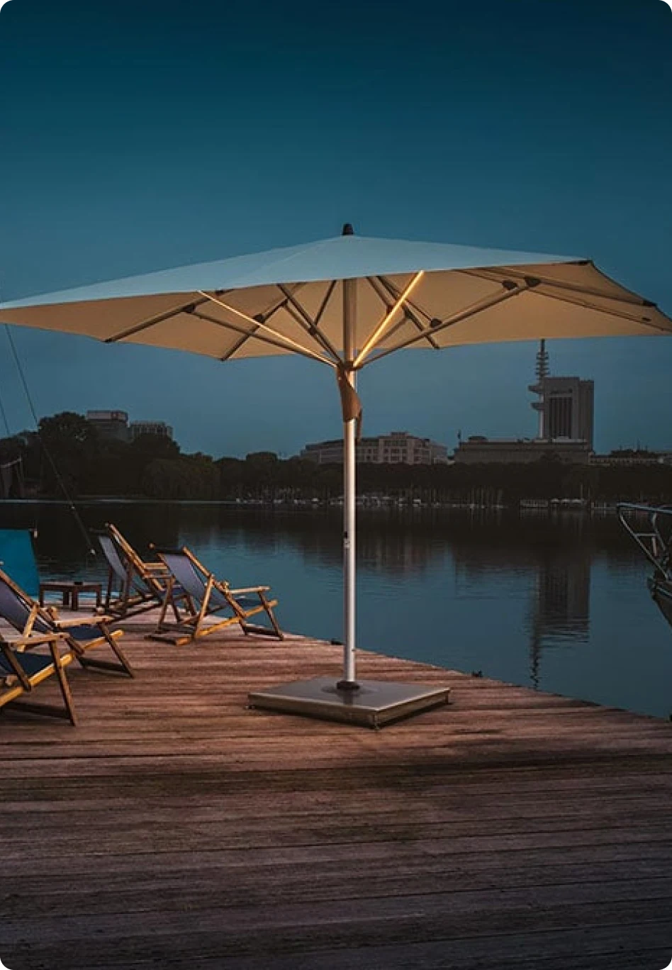 Le Fortello® LED est un parasol pour le jour et la nuit. De jour, il protège du soleil et de la pluie, et le soir il produit une lumière blanche chaude - au choix avec deux intensités - grâce à ses bandes LED intégrées dans les baleines.